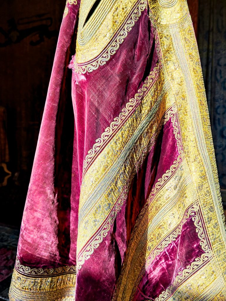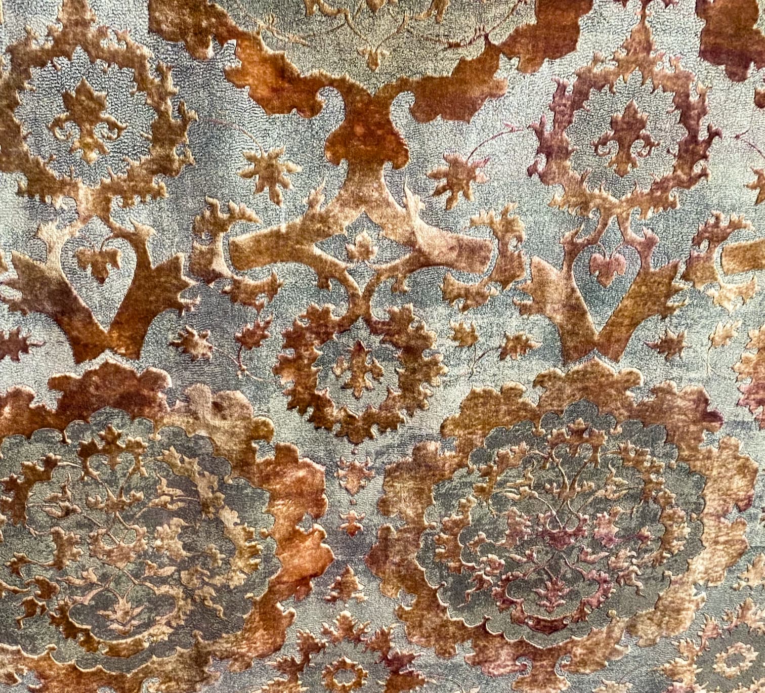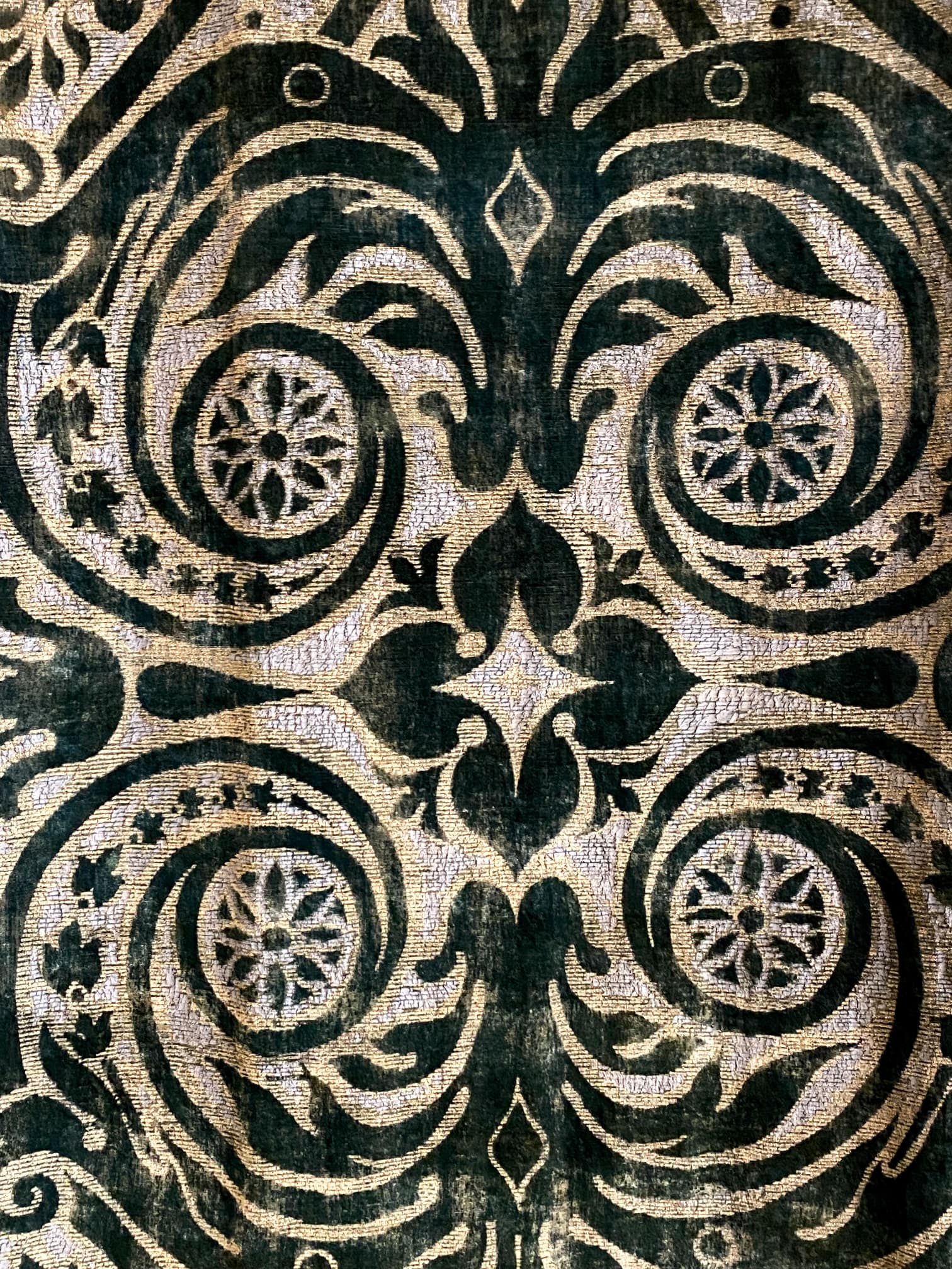 Cuando se menciona a Fortuny, también se piensa en los magníficos brocados, en los ricos terciopelos de colores ámbar, cobrizos y dorados sobre los que la pareja estampaba motivos con plantillas, fruto de su creación. Con ellos confeccionaban abrigos, cortinas, bufandas, cojines y tapices.